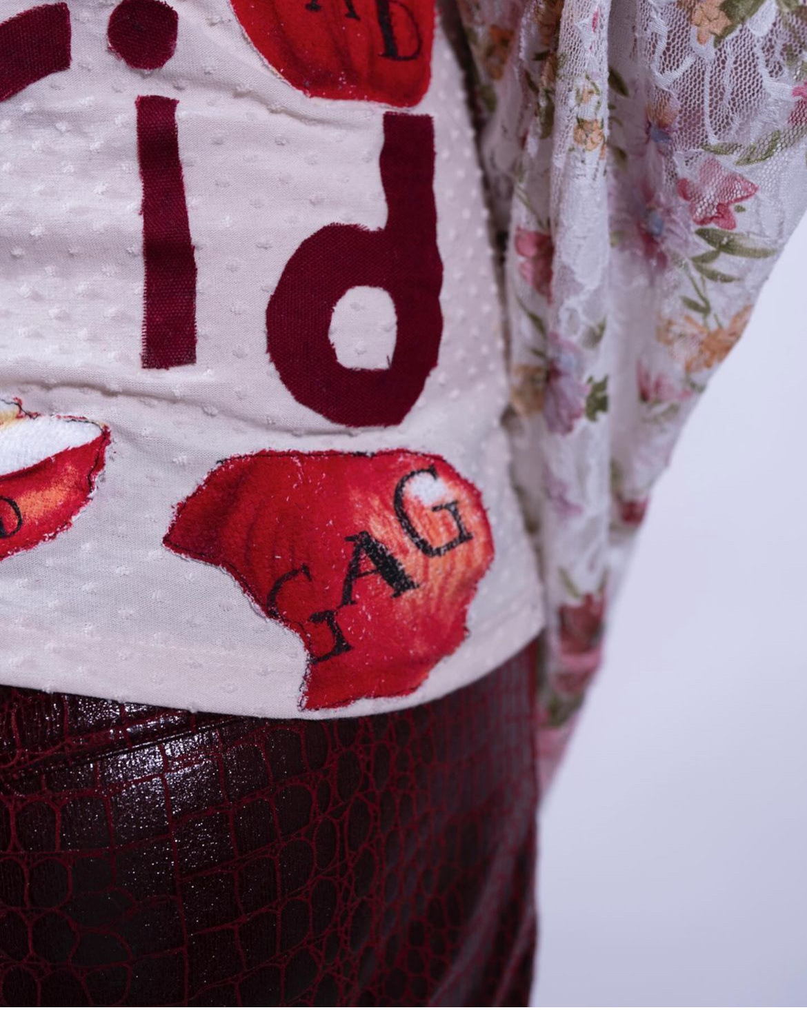 This piece is an homage to the nursery rhyme "Girl With The Curl", which is told in totality throughout the shirt and capelet.